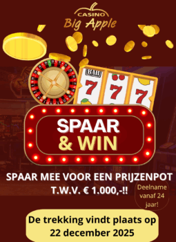 Spaar vanaf 1 december mee voor een totale prijzenpot van € 1.000,- bij Big Apple Arnhem. Spaar mee en maak kans op cash. Bezoek ons casino in Arnhem vanaf 1 december en ontvang een lot. Deelname vanaf 24 jaar! Om kans te maken op een prijs dien je aanwezig te zijn tijdens de trekking. De trekkingen zijn op 22 december. Kijk hier voor de voorwaarden.